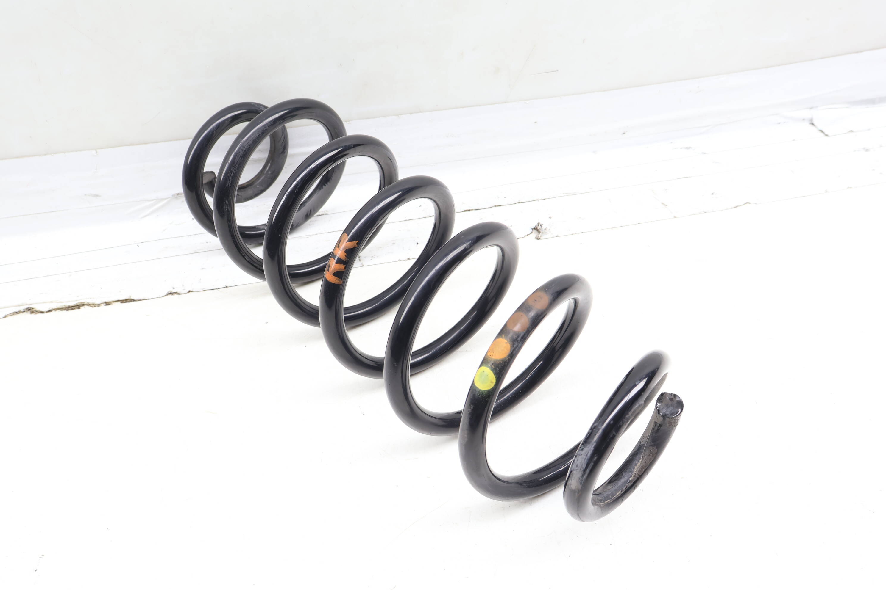 This genuine OEM coil spring, part number 8R0511115CS, is designed for specific Audi models, ensuring optimal performance and safety. Compatible with 2013-2017 Audi Q5 and SQ5 variants, including Premium, Premium Plus, and Prestige trims, this rear coil spring supports both 2.0L and 3.0L engine configurations. Found at the rear left or right of the suspension system, it plays a crucial role in maintaining ride height and absorbing shocks from road imperfections. Typical issues this coil spring addresses include wear, damage, or failure, which can adversely affect handling and ride quality. The part features color markings of 1 yellow, 1 orange, and 2 brown for proper identification.