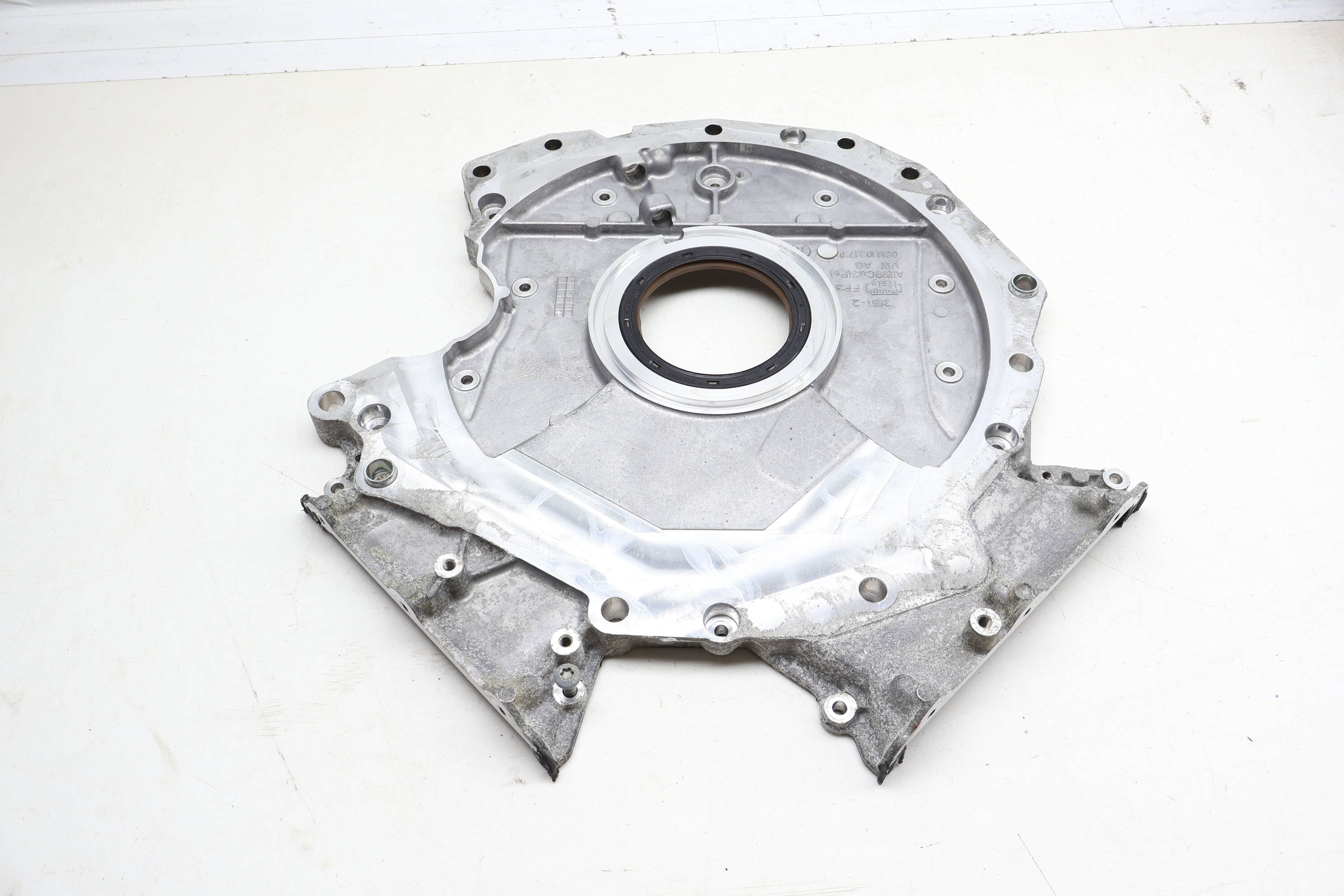 The ENGINE COVER SEALING FLANGE / PLATE (OEM part number 06M103173R) is positioned at the lower rear of the engine, serving as an essential component in sealing the engine cover area. This part ensures proper sealing to prevent oil leaks and protects internal components from contaminants, thus supporting optimal engine performance.