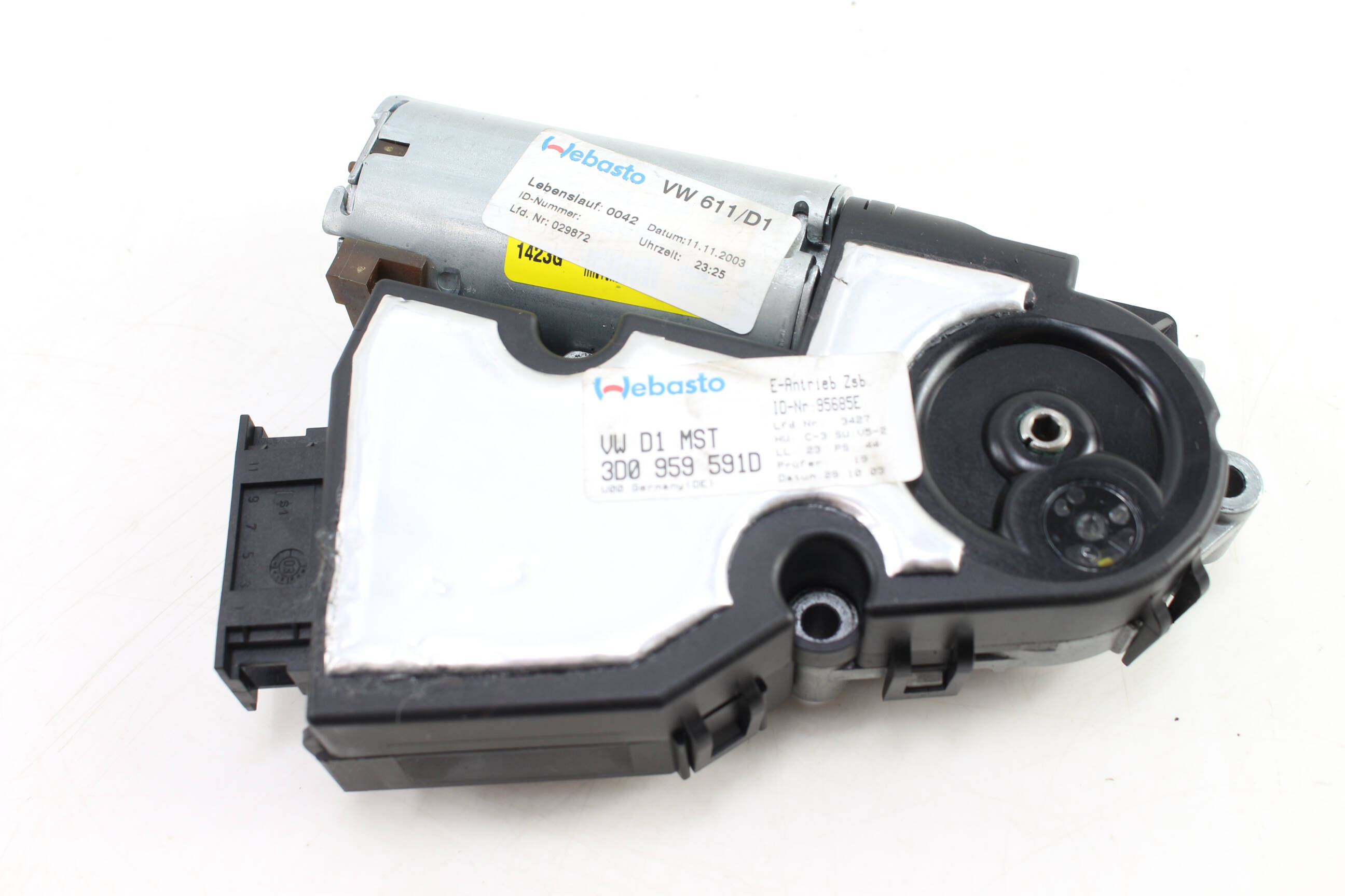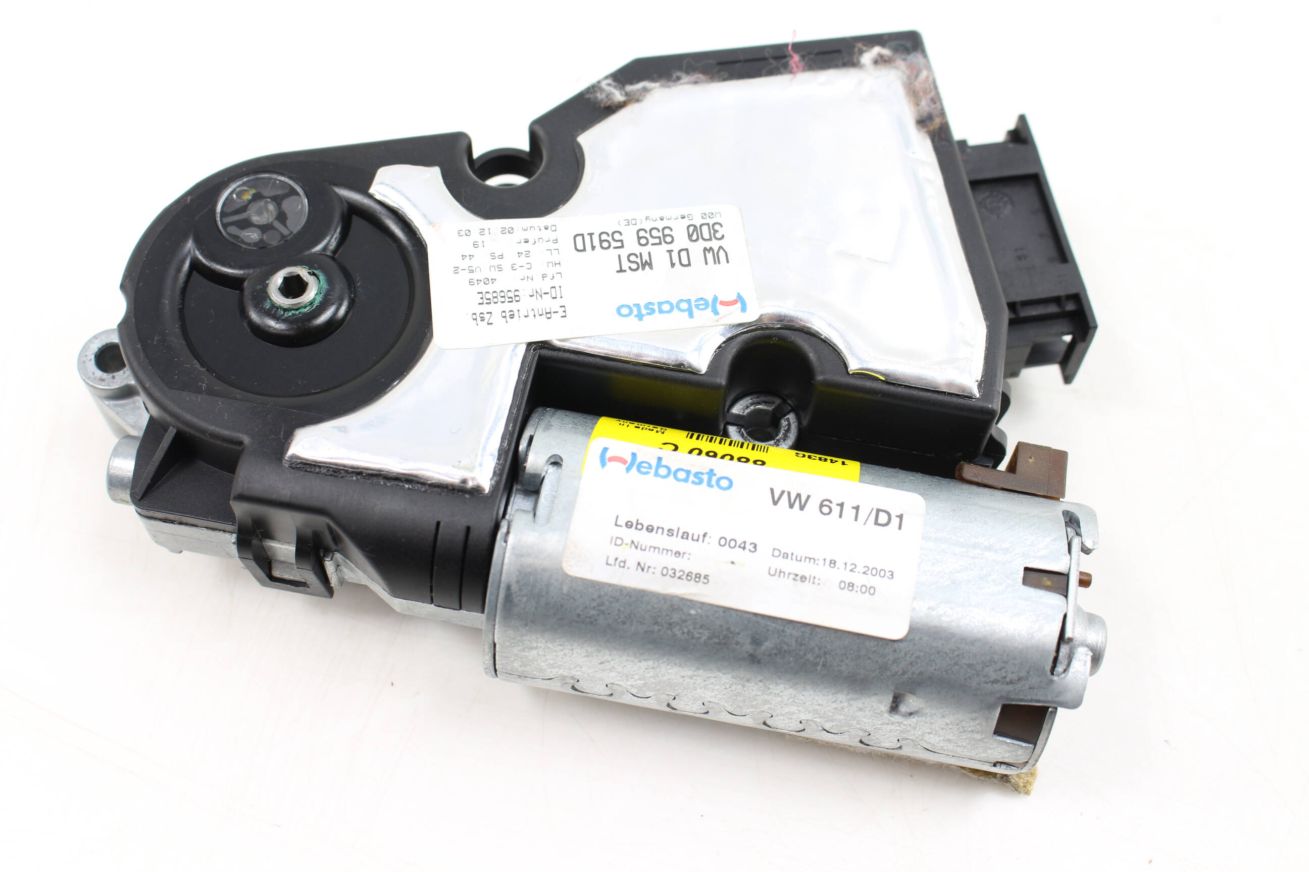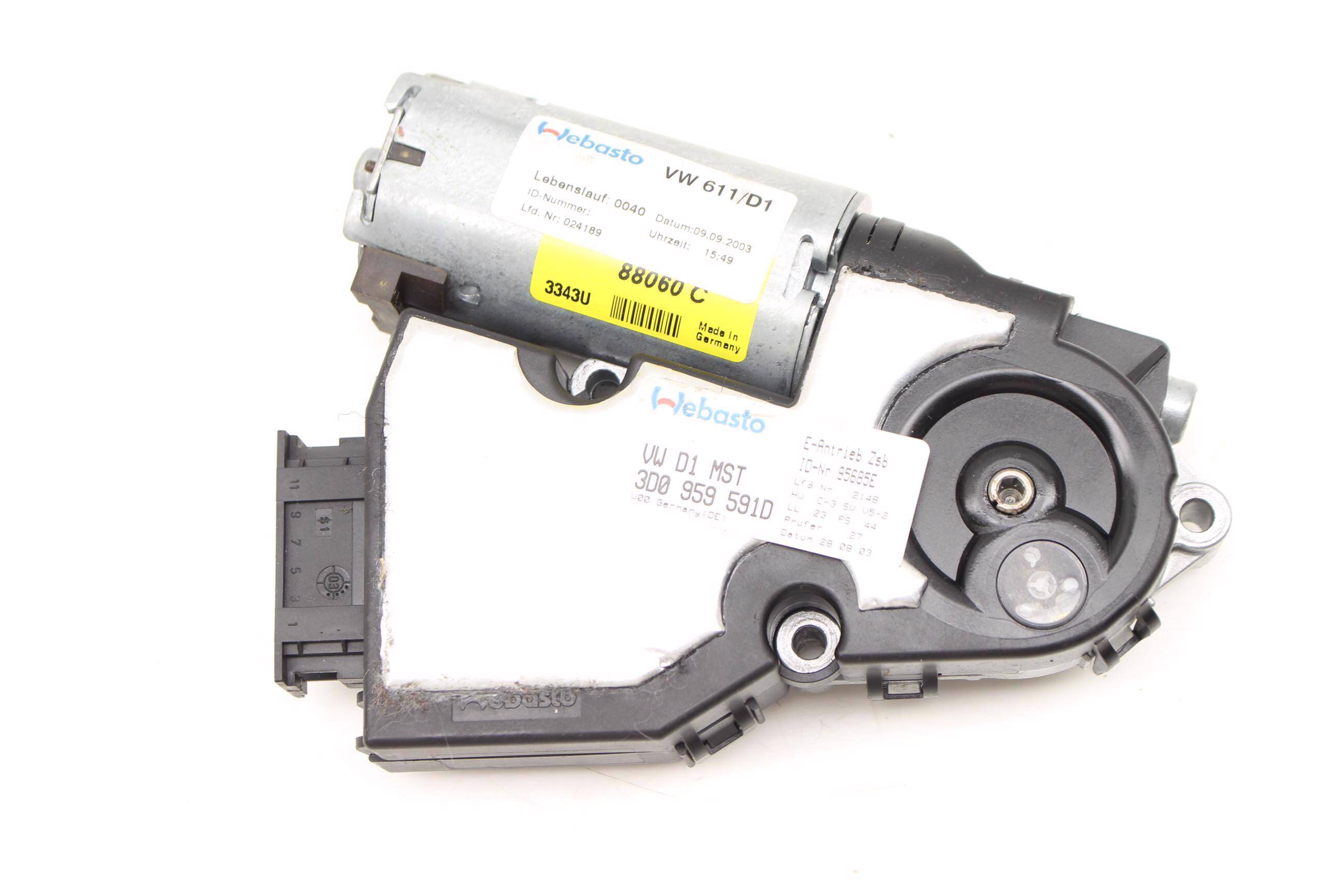 Restore the functionality of your Volkswagen Phaeton with this genuine OEM sliding sunroof motor, part number 3D0959591D. Located within the roof assembly, this motor plays a critical role in operating the sunroof, allowing smooth opening and closing of the glass panel. If you've experienced a non-functioning sunroof or erratic movement, this part is essential for repair. Compatible with 2004-2006 Volkswagen Phaeton models with both the 4.2L V8 and 6.0L W12 engines, this motor is an exact match sourced from salvage vehicles, ensuring authenticity. Alternate part numbers include 3D0959591 and others, making it a versatile choice for your restoration needs.